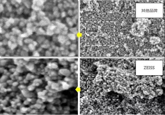 材料表面组织形态越精细,弱信号的检测灵敏度对FE-SEM的成像影响越大,以图6的Fe3O4磁性粉末为例,20万倍的情况下还看不出来ZEISS与其他品牌之间有很大的区别,但将图中微区进一步放大,很明显ZEISS FE-SEM在噪点的控制上表现更好。